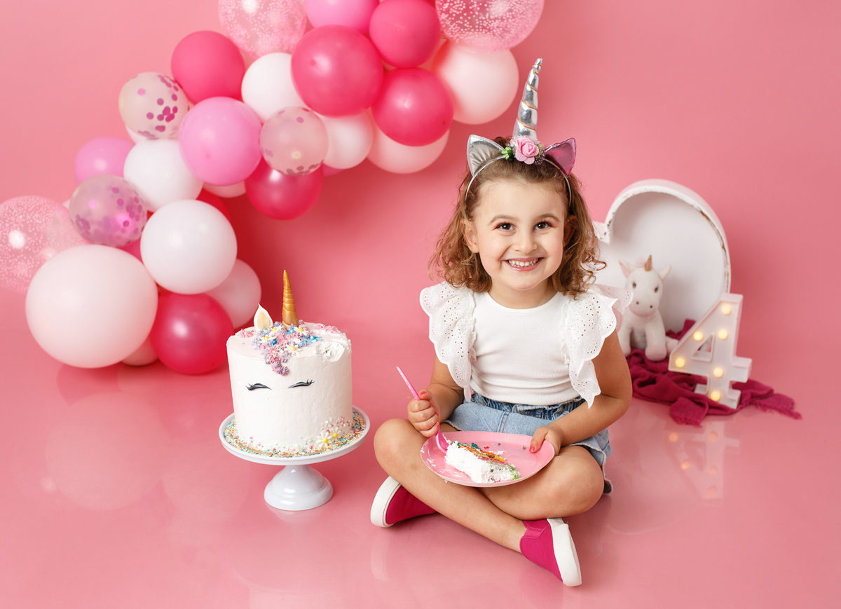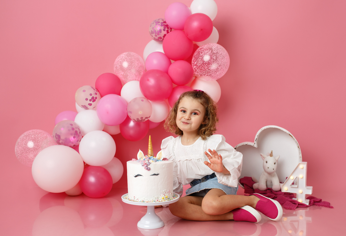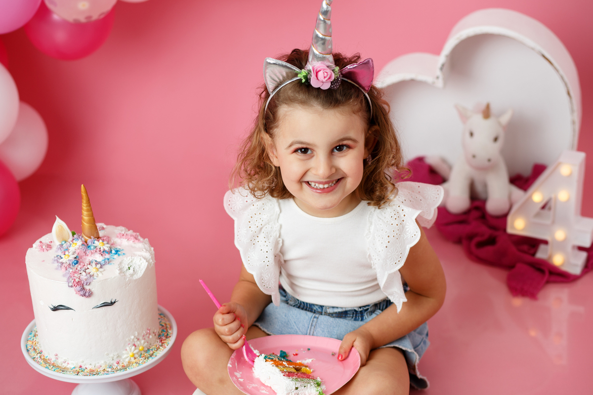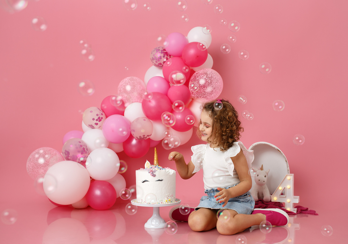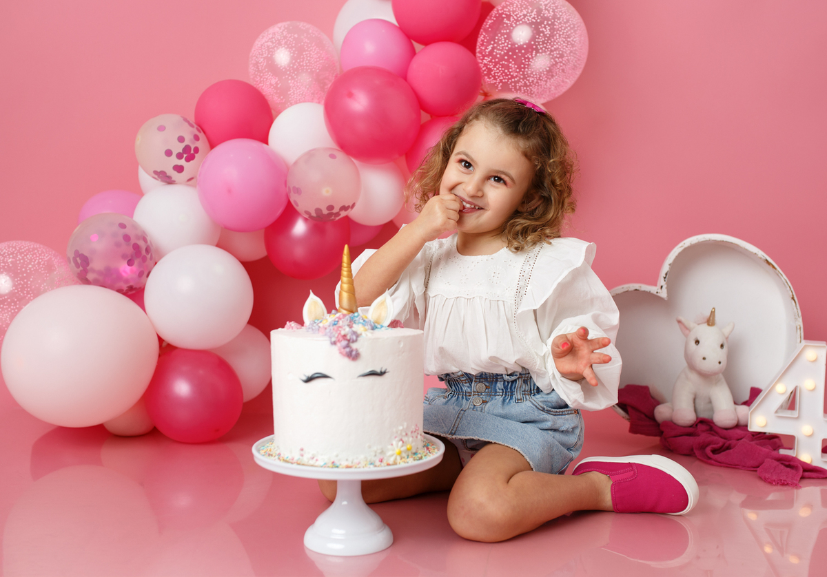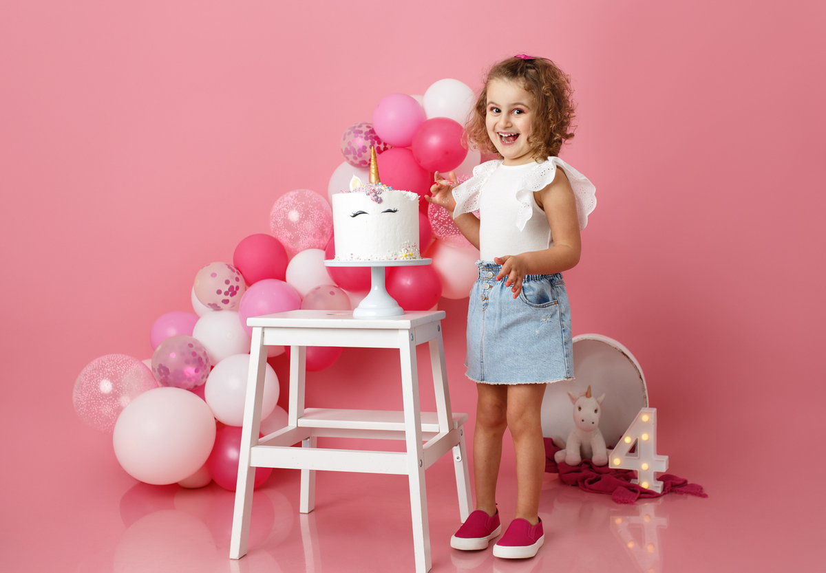 A sessão smash the cake da nossa Dianinha só podia ser muito colorida e divertida. É uma menina alegre, sorridente, bem disposta que adora cor, alegria e arco-íris. Com todas as suas características só podíamos escolher o cenário rosa "forte" como ela diz, um bolo unicórnio e arco-irís por dentro que ela amou e terminar a festa com confettis.