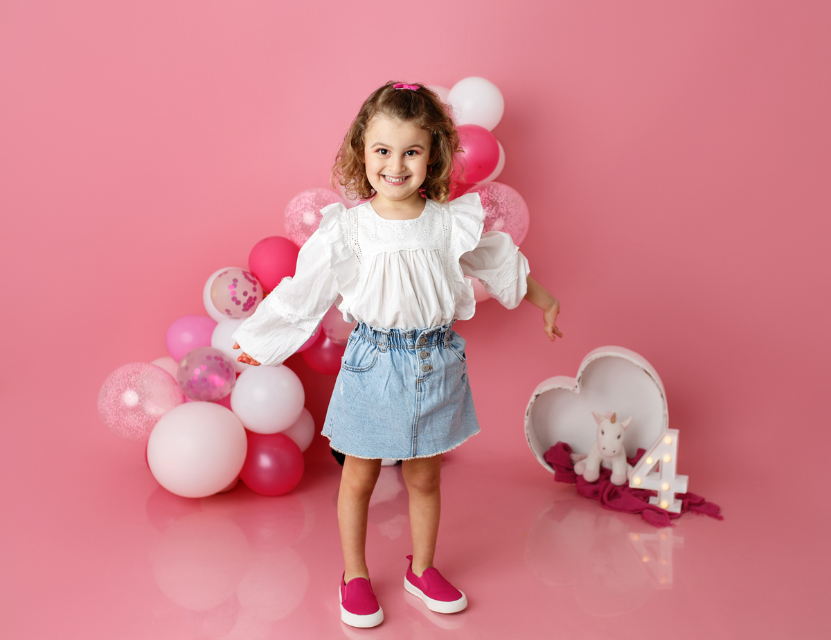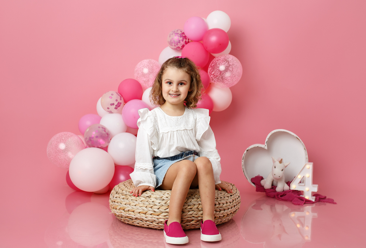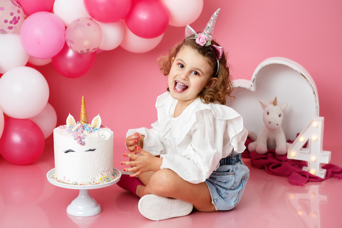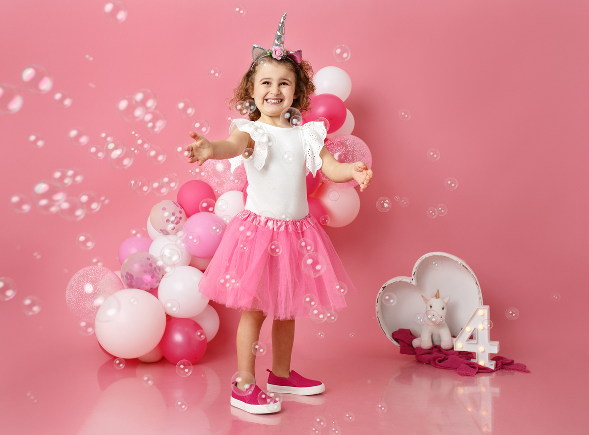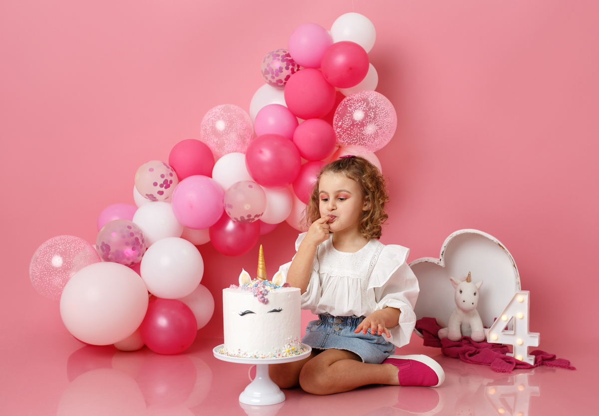 A sessão smash the cake da nossa Dianinha só podia ser muito colorida e divertida. É uma menina alegre, sorridente, bem disposta que adora cor, alegria e arco-íris. Com todas as suas características só podíamos escolher o cenário rosa "forte" como ela diz, um bolo unicórnio e arco-irís por dentro que ela amou e terminar a festa com confettis.