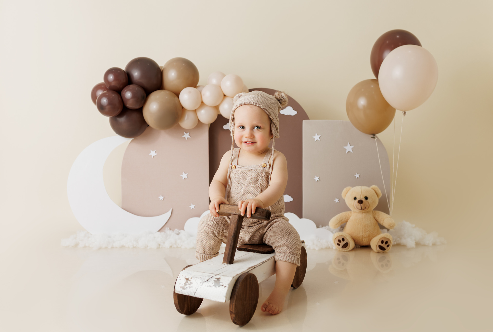 O cenário da sessão Smash the cake é criado de forma personalizada, pensado exclusivamente para cada criança.