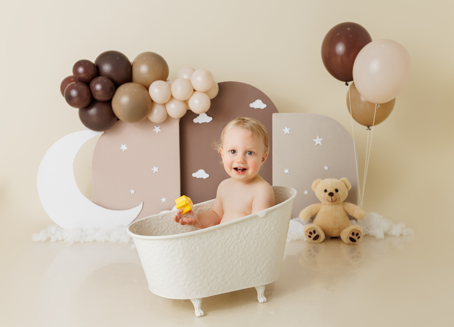 A última fase é dedicada ao banho, onde o bebé toma uma banhoca acompanhada por bolinhas de sabão. Esta fase é muito divertida, pois geralmente os bebés adoram água. É o momento perfeito para captar expressões de alegria e relaxamento, encerrando a sessão de uma forma leve e animada.
